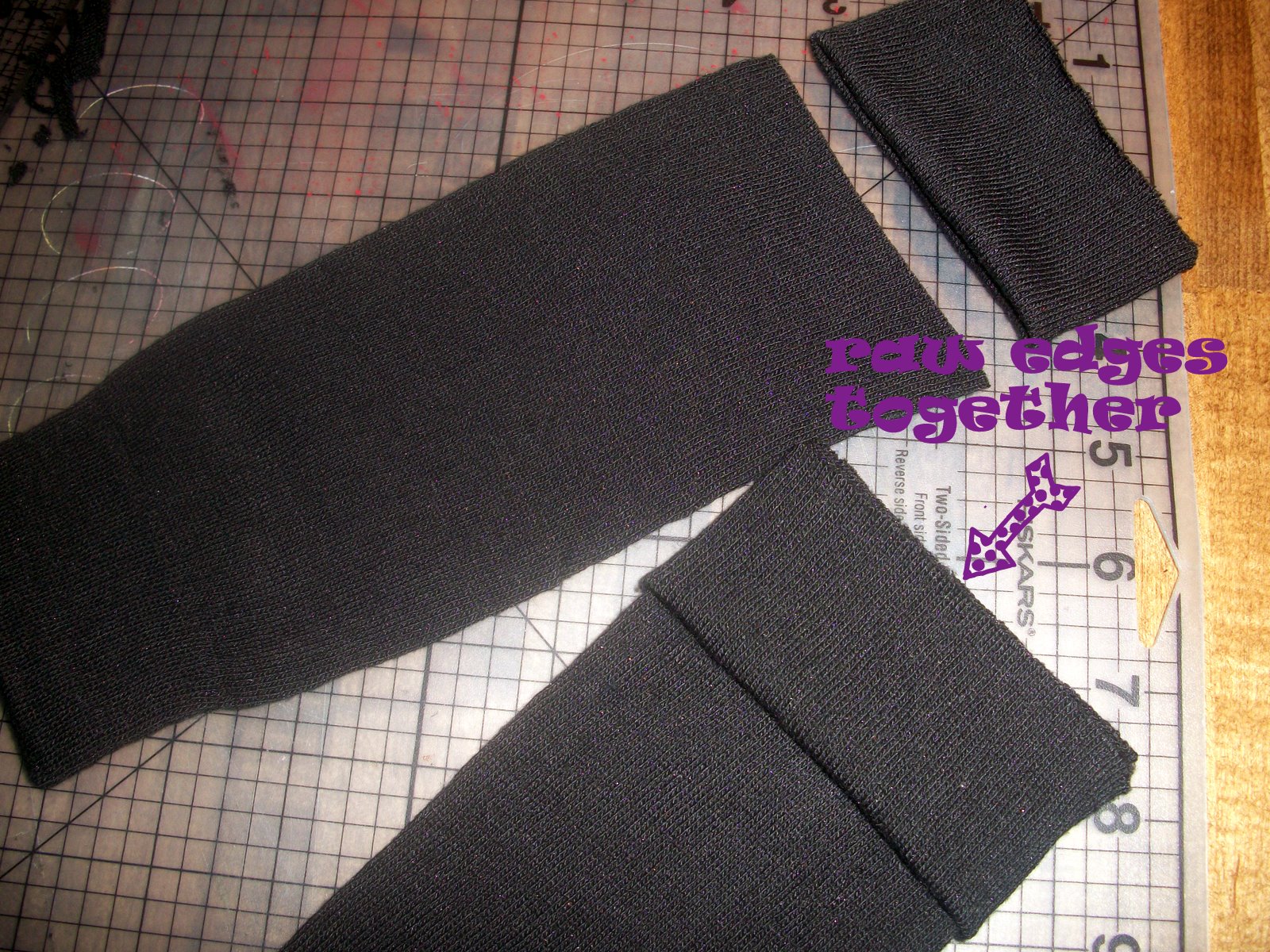 Next slip the cuff over the long piece of cut sock. Placing all the raw edges together.