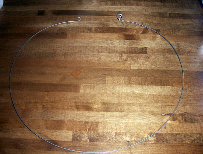Take a heavy duty wire and curl one end into a hook, and the other end into a swirly ring. Make sure your ring is big enough that the tab of the can cannot slip over it. This step will not only help with building your wreath, but also putting it together.