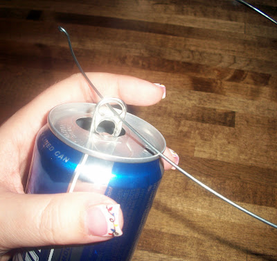 After all your cans are smooshed, it's time to start placing them on the wreath. Gently pull the tab up, and slip the hook side thru the large opening on the tab. The more you put on the wire, the wreath will pretty much just fill itself out.