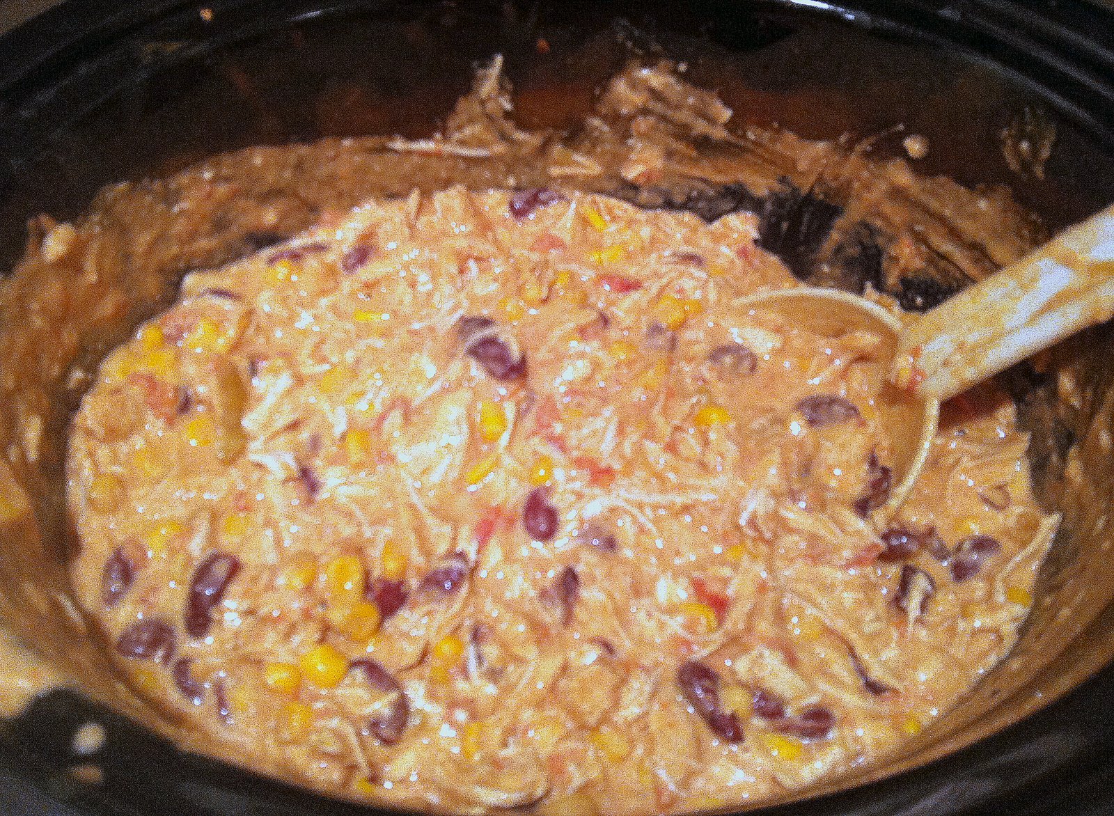 After letting it cook, shred your chicken. You can do this in the crock pot, or scoop it on a plate and do it with a fork. The enchiladas will look soupy, but once it is shredded it will soak up the extra soup.